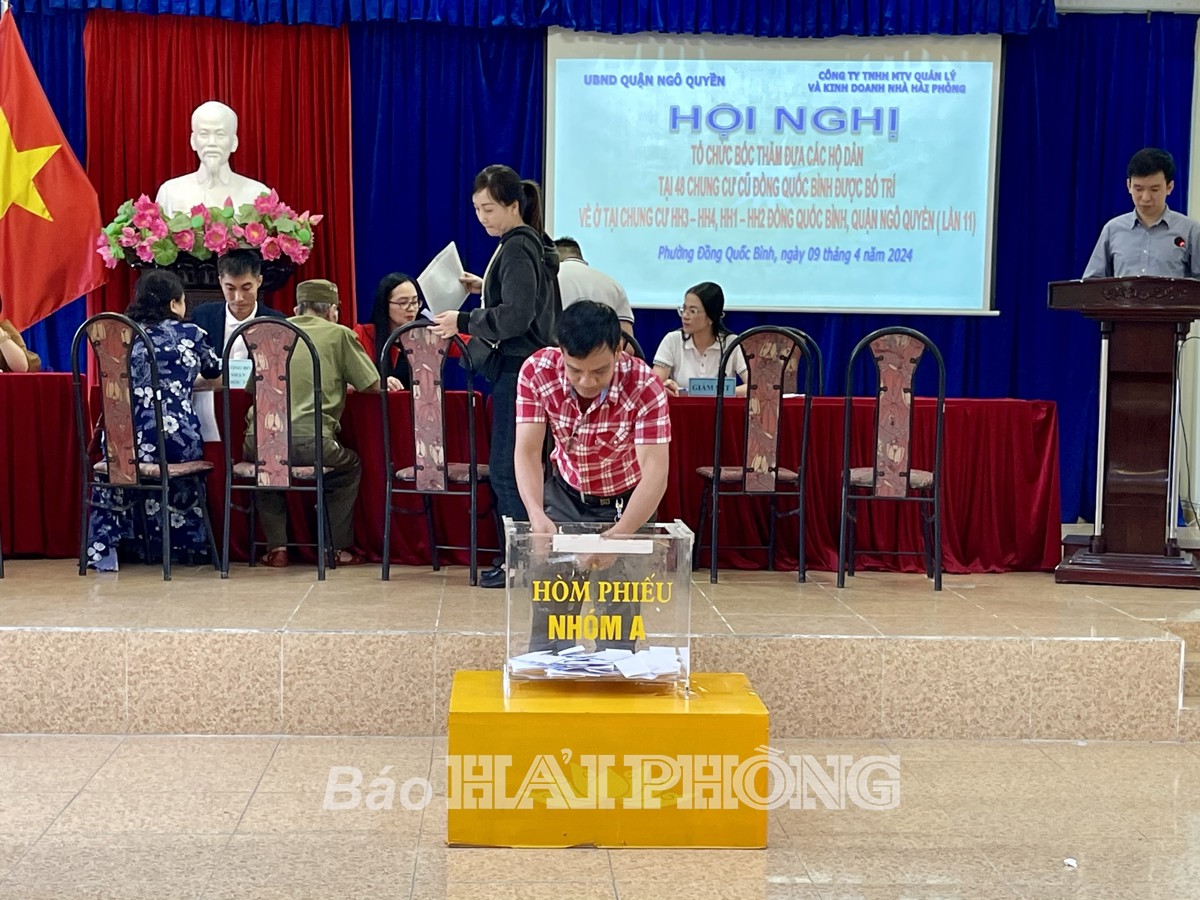 Chiều 9/4, UBND quận Ngô Quyền phối hợp với Công ty TNHH MTV Quản lý và Kinh doanh nhà, Sở Xây dựng tổ chức bốc thăm lần 11 xác định vị trí căn hộ đối với các hộ dân tại các chung cư cũ tại phường Đồng Quốc Bình đủ điều kiện được bố trí về ở chung cư HH3-HH4 và HH1.