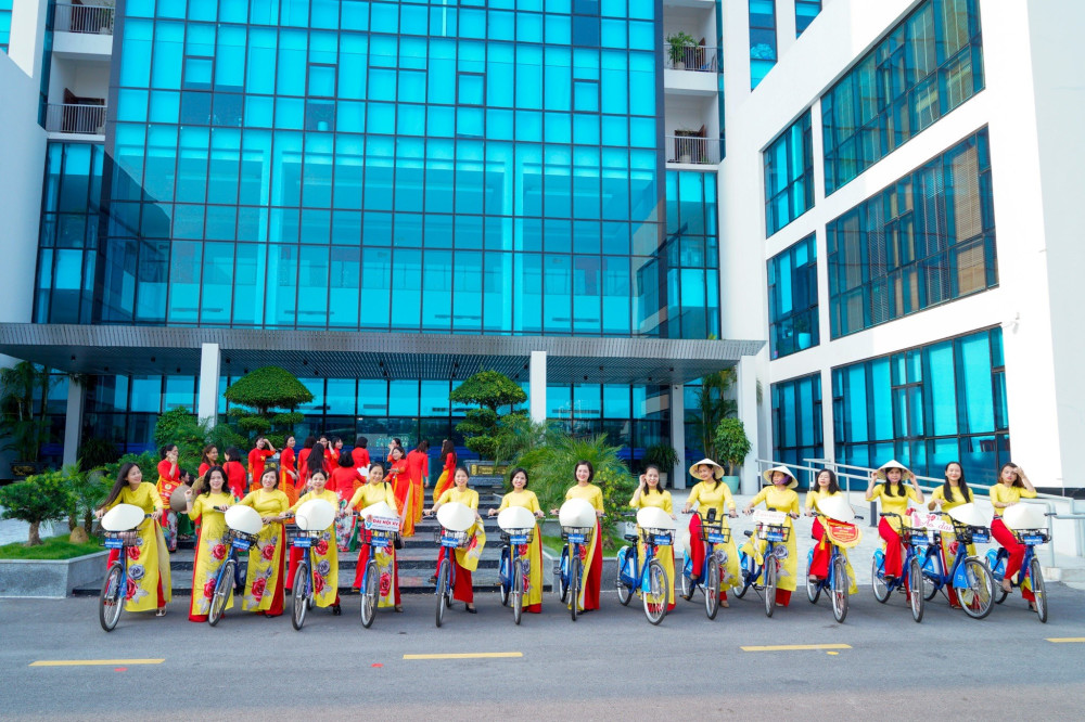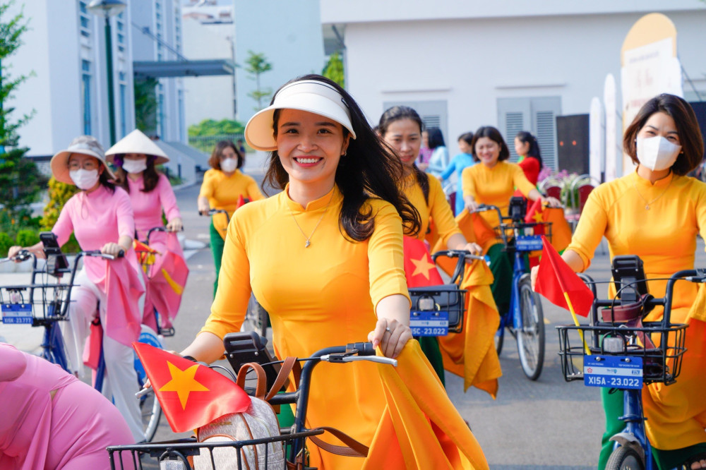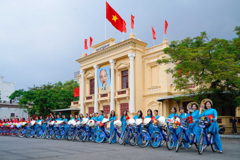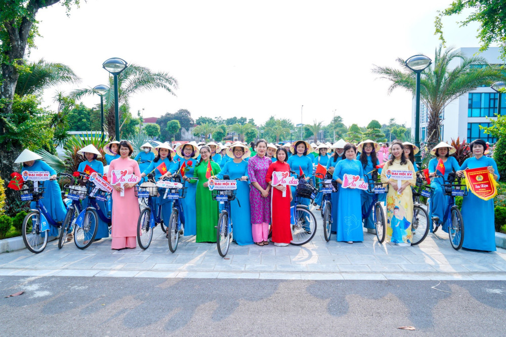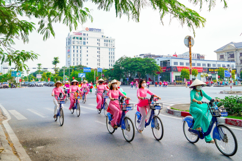 Nữ đoàn viên, CNVCLĐ quận Ngô Quyền mặc áo dài đạp xe diễu hành trên các tuyến đường chính.