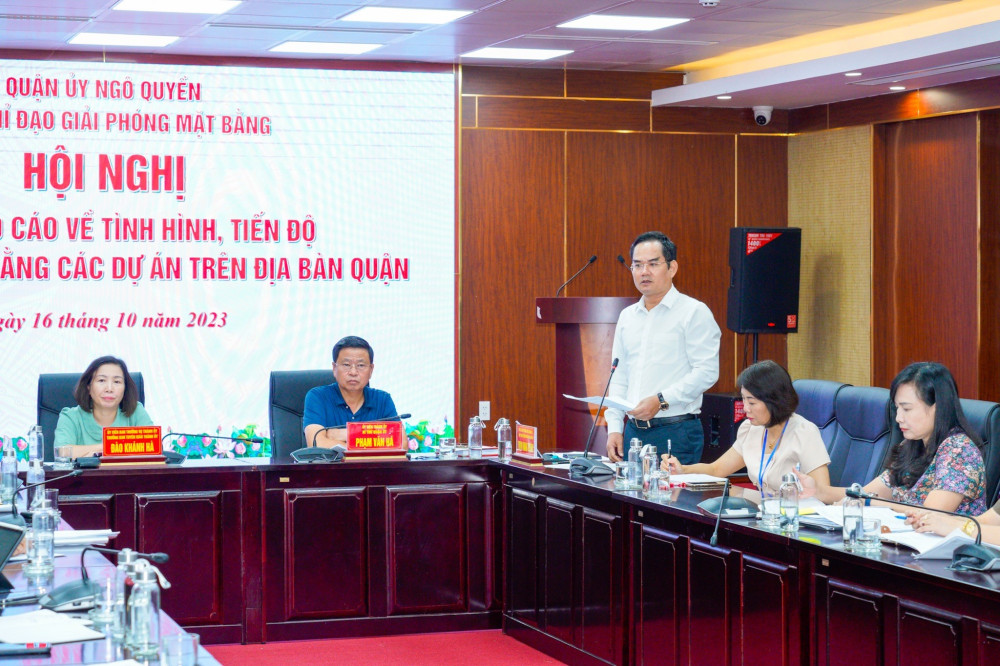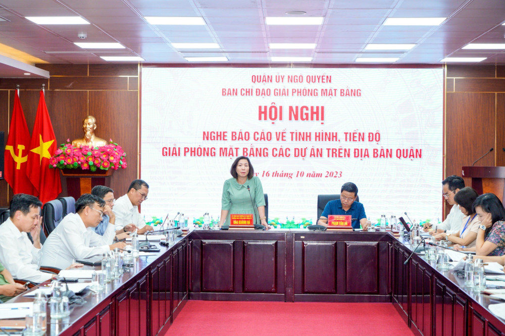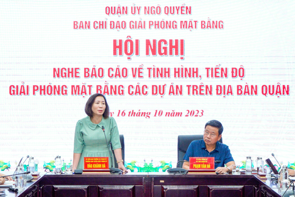 Đồng chí Đào Khánh Hà, Trưởng Ban Tuyên giáo Thành uỷ ghi nhận, đánh giá cao sự nỗ lực, cố gắng của Quận Ngô Quyền trong công tác GPMB. Trong đó, công tác GPMB các dự án trọng điểm có rất nhiều khó khăn, phức tạp, áp lực như dự án Khu nhà ở xã hội tại Tổng kho 3 Lạc Viên. Đồng thời, yêu cầu Quận Ngô Quyền rà soát lại tổng thể 22 dự án; xác định rõ những vấn đề trọng tâm cốt lõi và có phương án giái quyết. Bên cạnh đó, bảo đảm quyền lợi của nhân dân; giải quyết kịp thời các kiến nghị xác đáng nếu thuộc thẩm quyền của quận; đề xuất phương án với thành phố nếu vượt thẩm quyền.