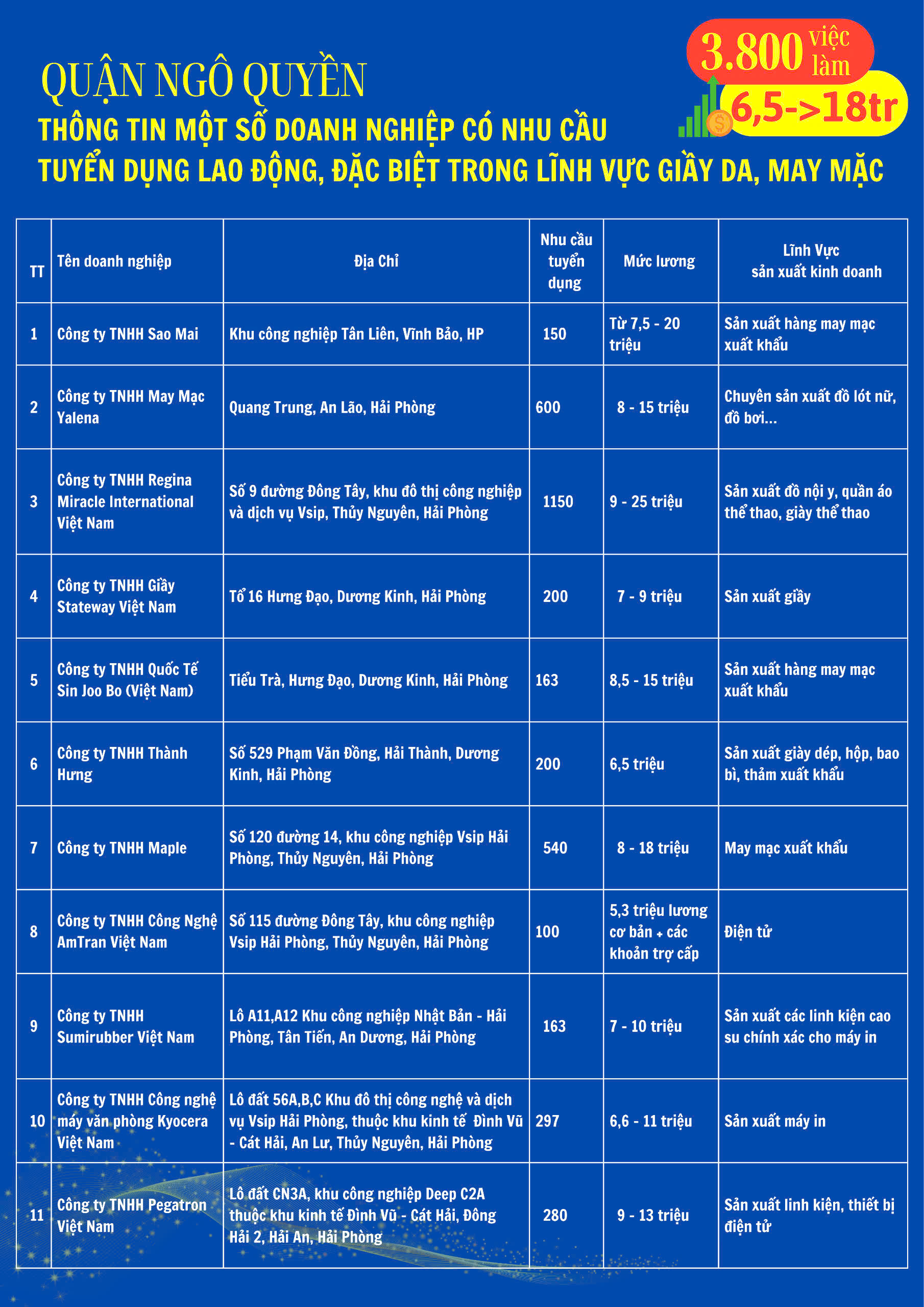 Nhằm giải quyết việc làm cho người lao động sau khi cưỡng chế, quận Ngô Quyền, thông tin đến người lao động trên địa bàn về một số doanh nghiệp có nhu cầu tuyển dụng lao động, đặc biệt là các doanh nghiệp sản xuất trong lĩnh vực giầy da, may mặc. Mức lương từ 6,5 đến 18 triệu/tháng.