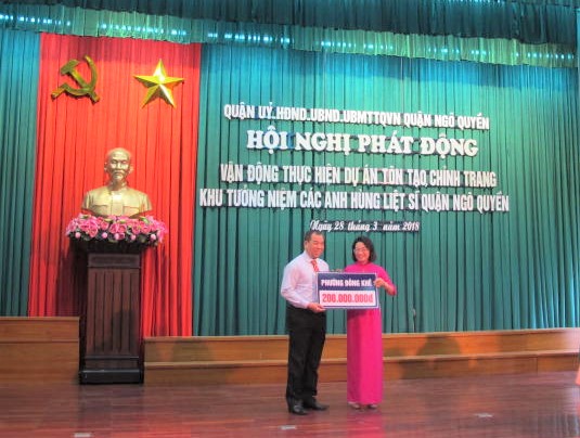 Công tác tuyên truyền, vận động các tổ chức cá nhân, doanh nghiệp đóng góp kinh phí cho công tác đền ơn đáp nghĩa nói chung và thực hiện dự án tôn tạo, chỉnh trang khu tưởng niệm các anh hùng liệt sĩ quận Ngô Quyền nói riêng được triển khai tích cực. Tính đến thời điểm hiện tại, Ban Vận động kinh phí thực hiện Dự án đã nhận được ủng hộ của các cơ quan, đơn vị, doanh nghiệp, trường học, các nhà hảo tâm và nhân dân trong và ngoài quận số tiền gần 6 tỷ đồng.