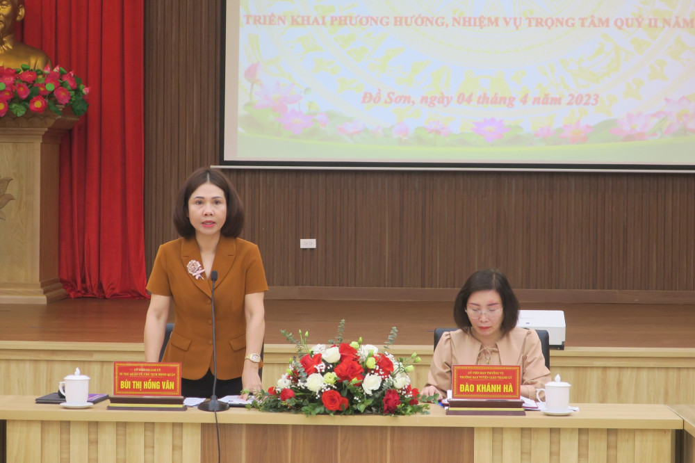 Đồng chí Trưởng ban Tuyên giáo Thành ủy nhất trí với các nhiệm vụ Quận đề ra trong quý II/2023, song cần lưu ý tăng cường hơn nữa công tác quản lý quy hoạch, quản lý đất đai; tích cực, chủ động nắm bắt tâm tư, nguyện vọng của nhân dân, nhất là trong công tác đền bù, giải phóng mặt bằng phục vụ triển khai các dự án; xây dựng các chương trình hành động sát với điều kiện thực tế tại địa phương; tổ chức các đợt sinh hoạt chính trị, thực hiện tốt vai trò nêu gương của cán bộ, Đảng viên; nâng cao chất lượng công tác phản biện xã hội, an sinh xã hội, giải phóng mặt bằng của Mặt trận tổ quốc và các tổ chức thành viên. Đặc biệt, tập trung tổ chức tốt Liên hoan du lịch 2023, tạo sức lan tỏa, thu hút, hấp dẫn, đảm bảo an ninh, an toàn, trật tự.