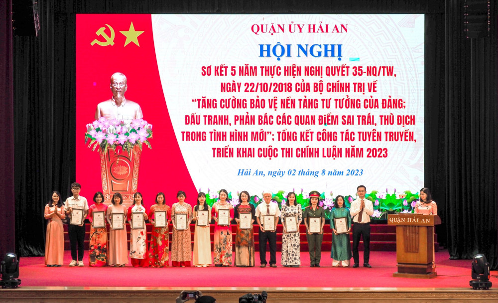Nhân dịp này, Ban Chỉ đạo 35 quận Hải An trao chứng nhận, khen thưởng 10 tập thể và 28 cá nhân; UBND quận Hải An tặng Bằng khen cho 3 tập thể và 3 cá nhân có thành tích xuất sắc triển khai thực hiện Nghị quyết số 35-NQ/TW và Cuộc thi Chính luận năm 2023 trên địa bàn quận.