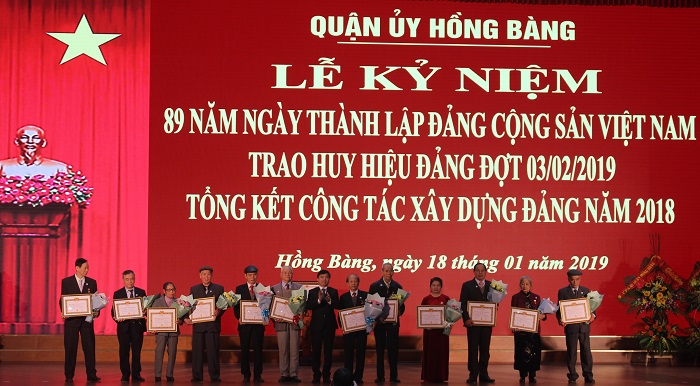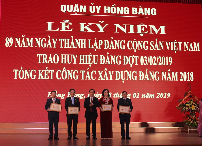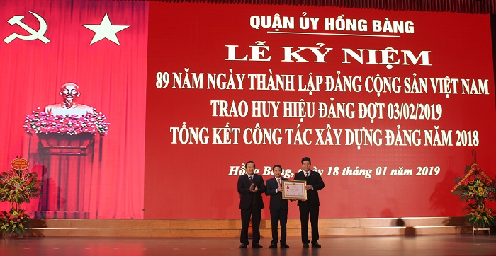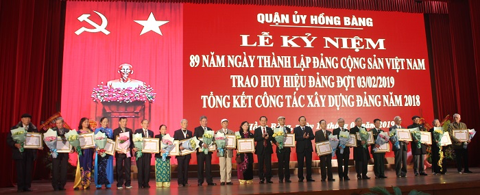 Ngày 18-1, Quận ủy Hồng Bàng tổ chức Lễ kỷ niệm 89 năm Ngày thành lập Đảng Cộng sản Việt Nam; trao tặng Huy hiệu Đảng đợt 3-2 tới đảng viên 50 năm tuổi Đảng trở lên; trao Huân chương Lao động, Kỷ niệm chương “Vì sự nghiệp Dân vận”; tổng kết công tác xây dựng Đảng năm 2018. Tới dự có các đồng chí: Nguyễn Hữu Doãn, Trưởng ban Tuyên giáo Thành ủy; Đoàn Văn Chương, Bí thư Quận ủy Hồng Bàng; Trần Quang Tuấn, Chủ tịch HĐND quận Hồng Bàng; Dương Đình Ổn, Chủ tịch UBND quận Hồng Bàng.