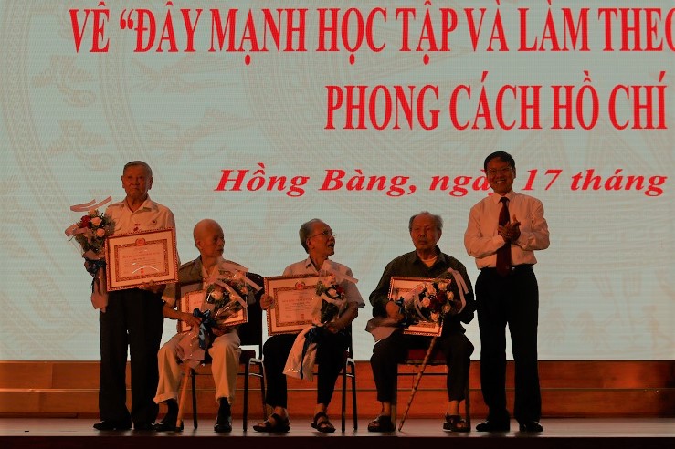 Bí thư Quận ủy Hồng Bàng Đoàn Văn Chương trao Huy hiệu 70 năm tuổi Đảng tặng các Đảng viên lão thành của quận