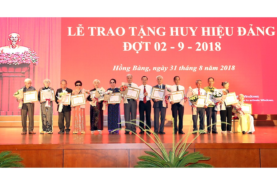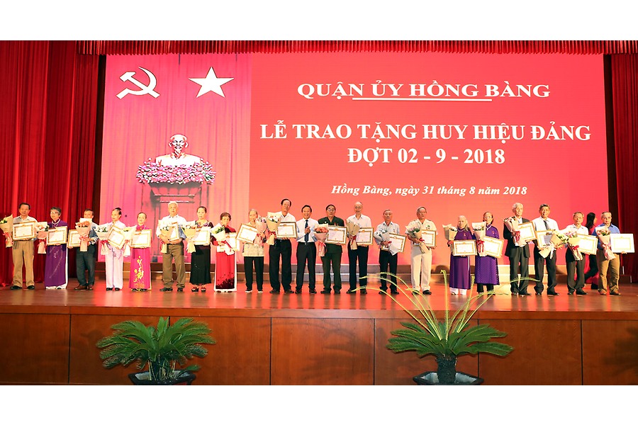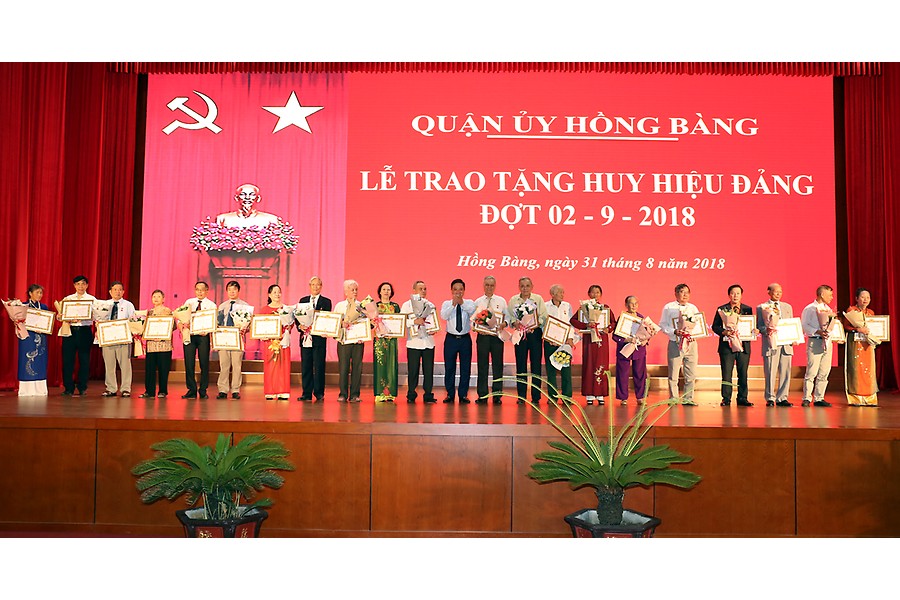 Đợt này, Đảng bộ quận Hồng Bàng có 163 đảng viên được trao huy hiệu Đảng, trong đó 5 đảng viên 70 năm tuổi Đảng; 1 đảng viên 65 năm tuổi Đảng; 4 đảng viên 60 năm tuổi Đảng; 18 đảng viên 55 tuổi Đảng, 51 đảng viên 50 năm tuổi Đảng và 84 đảng viên 45, 40 và 30 năm tuổi Đảng. Quận ủy tổ chức trao tặng các đảng viên từ 50 tuổi Đảng trở lên. Các đảng viên 45, 40 và 30 năm tuổi Đảng được Đảng bộ các phường tổ chức trao.