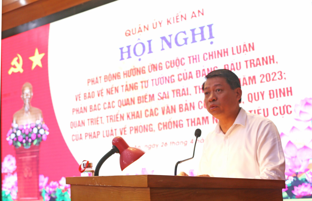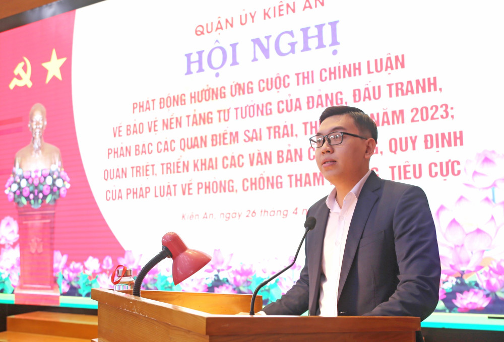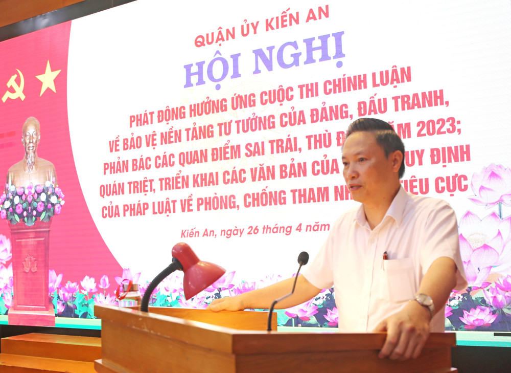 Phát biểu tại Hội nghị, đồng chí Phạm Văn Khanh, Bí thư Quận ủy, Chủ tịch HĐND quận Kiến An nhấn mạnh: Bảo vệ nền tảng tư tưởng của Đảng, đấu tranh phản bác các quan điểm sai trái, thù địch; phòng chống tham nhũng, tiêu cực là nhiệm vụ đặc biệt quan trọng của Đảng và của cả hệ thống chính trị trong giai đoạn hiện nay; là trách nhiệm của mỗi cán bộ, đảng viên. Việc hưởng ứng Cuộc thi chính luận là trách nhiệm, tâm huyết; là hành động cụ thể của mỗi cán bộ, đảng viên và Nhân dân quận Kiến An đối với công tác bảo vệ nền tảng tư tưởng của Đảng, góp phần tạo chuyến biến mạnh mẽ trong thực hiện Nghị quyết số 35 của Bộ Chính trị. Đồng chí Bí thư Quận ủy đề nghị cấp ủy, lãnh đạo các cơ quan đơn vị trên địa bàn quận tuyên truyền vận động cán bộ, đảng viên và Nhân dân hưởng ứng, tham gia Cuộc thi; giao Ban Tuyên giáo Quận ủy, sau Hội nghị phát động hưởng ứng Cuộc thi Chính luận, khẩn trương tham mưu tổ chức Hội nghị tập huấn cho các đơn vị, qua đó giúp các bài viết, các tác phẩm dự thi đạt chất lượng tốt.
