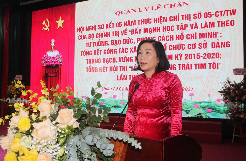 5 năm qua, tư tưởng của Chủ tịch Hồ Chí Minh đã trở thành sợi chỉ đỏ xuyên suốt, thống nhất trong suy nghĩ, tác phong và hành động của mỗi cán bộ, đảng viên, nhân dân sinh sống trên địa bàn quận. Thực hiện Chỉ thị 05-CT/TW của Bộ Chính trị về đẩy mạnh Học tập và làm theo tư tưởng, đạo đức, phong cách Hồ Chí Minh, đã có 279 cá nhân, tổ chức tiêu biểu, các mô hình học và làm theo Bác bước ra từ thực tiễn đời sống, đóng góp không nhỏ vào sự phát triển kinh tế, an sinh xã hội của quận Lê Chân. Quận đã tổ chức 69 hội nghị quán triệt Chỉ thị dưới hình thức trực tiếp và trực tuyến hàng nghìn với lượt cán bộ, đảng viên tham gia. Để việc thực hiện Chị thị 05-CT/TW đi vào thực chất và có chiều sâu, đồng thời, không khô cứng, 3 năm liên tục, quận tổ chức thành công Hội thi “Lê Chân trong trái tim tôi” với hình thức đa dạng, phong phú, linh hoạt, phù hợp với tình hình thực tế. Đây cũng chính là điểm nhấn để Lê Chân thực sự nổi bật và là điểm sáng của thành phố trong triển khai thực hiện Chỉ thị 05-CT/TW.