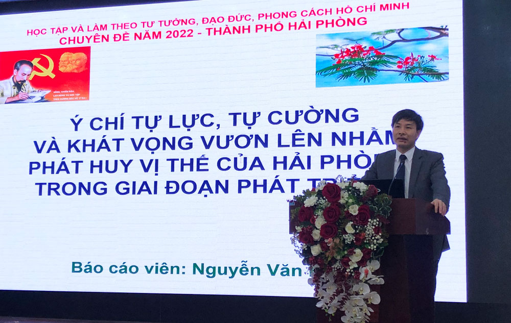 Hội nghị được nghe đồng chí Nguyễn Văn Hiểu, Phó Trưởng Ban Tuyên giáo Thành ủy quán triệt Chuyên đề học tập và làm theo tư tưởng, đạo đức, phong cách Hồ Chí Minh năm 2022 “về ý chí tự lực, tự cường và khát vọng vươn lên nhằm phát huy vị thế của Hải Phòng trong giai đoạn phát triển mới”. Trong đó nhấn mạnh những nội dung cơ bản của tư tưởng, đạo đức, phong cách Hồ Chí Minh về ý chí tự lực, tự cường và khát vọng phát triển đất nước phồn vinh, hạnh phúc; giá trị những lời dạy của Chủ tịch Hồ Chí Minh với Đảng bộ và Nhân dân Hải Phòng về vị thế và phát huy vị thế của Hải Phòng…