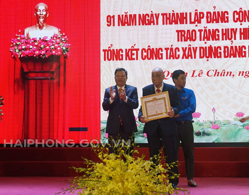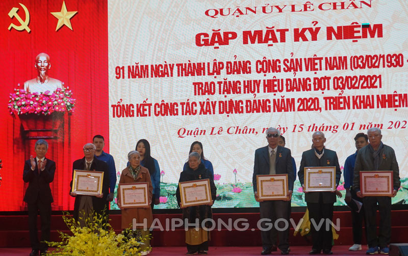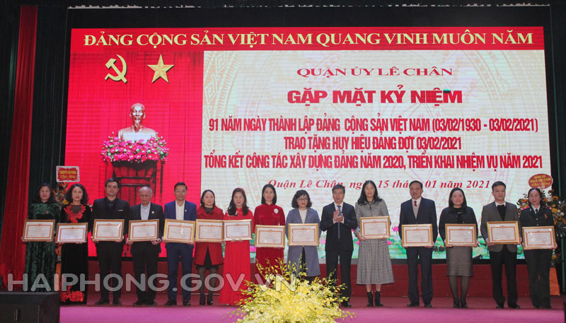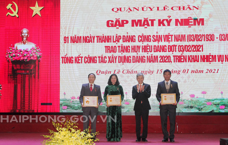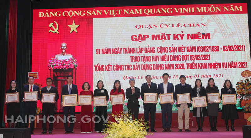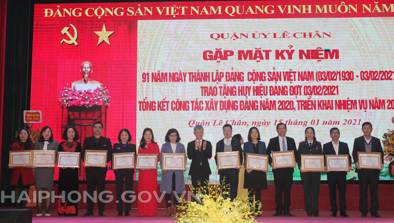 Sáng 15/1, Quận ủy Lê Chân tổ chức Gặp mặt kỷ niệm 91 năm Ngày thành lập Đảng Cộng sản Việt Nam; tổng kết công tác xây dựng Đảng; biểu dương tổ chức cơ sở Đảng, đảng viên năm 2020; triển khai phương hướng, nhiệm vụ năm 2021 và trao huy hiệu Đảng cho đảng viên đợt 3/2/2021. Tới dự có đồng chí Lê Trung Kiên, Ủy viên Ban Thường vụ Thành ủy, Trưởng Ban quản lý Khu Kinh tế Hải Phòng.