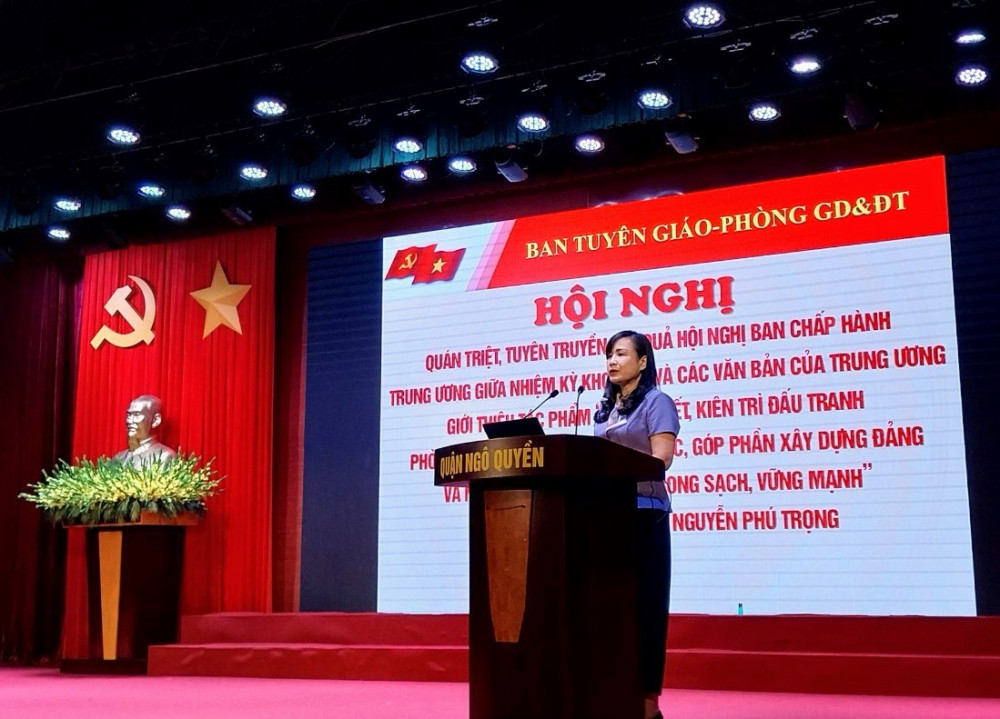 Phát biểu khai mạc chương trình, đồng chí Trịnh Quang Trường, Phó Bí thư Thường trực Quận ủy, Chủ tịch HĐND quận Ngô Quyền nêu rõ, công tác bồi dưỡng chính trị, giúp cho đội ngũ cán bộ lãnh đạo quản lý và giáo viên nắm vững những nội dung cơ bản, những quan điểm mới của Đảng trong các Nghị quyết, Quy định của Đảng thời gian qua, nhất là những nội dung cơ bản về kết quả Hội nghị giữa nhiệm kỳ Ban Chấp hành Trung ương Đảng khóa XIII; Tác phẩm “Kiên quyết, kiên trì đấu tranh phòng, chống tham nhũng, tiêu cực, góp phần xây dựng Đảng và Nhà nước ta ngày càng trong sạch, vững mạnh” của đồng chí Tổng Bí thư Nguyễn Phú Trọng; Quy định số 85-QĐ/TW ngày 07/10/2022 của Ban Bí thư về việc cán bộ, đảng viên thiết lập và sử dụng các trang thông tin điện tử cá nhân trên internet và mạng xã hội; Quy định số 99-QĐ/TW ngày 27/02/2023 của Ban Bí thư về cờ Đảng Cộng sản Việt Nam và việc sử dụng cờ Đảng; những vấn đề mới cần quan tâm trong đời sống chính trị-kinh tế-xã hội của đất nước, thành phố, quận Ngô Quyền và ngành giáo dục cũng như các vấn đề chuyên môn nghiêp vụ theo kế hoạch, nhiệm vụ năm học 2023-2024. Góp phần nâng cao trách nhiệm, bản lĩnh chính trị, niềm tin và chuẩn mực đạo đức nhà giáo, hoàn thành tốt mục tiêu, nhiệm vụ trong năm học mới, đáp ứng yêu cầu đổi mới căn bản, toàn diện giáo dục và đào tạo.