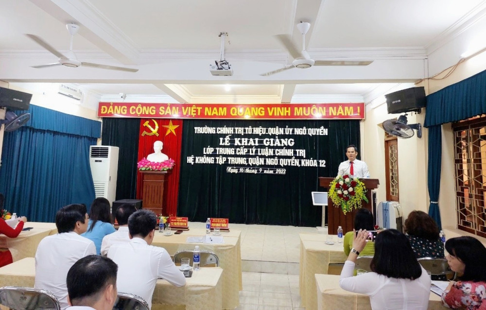 Phát biểu tại Lễ khai giảng, đồng chí Trịnh Quang Trường Phó Bí thư Thường trực Quận ủy, Chủ tịch HĐND quận Ngô Quyền cho biết, thực hiện mục tiêu đào tạo, bồi dưỡng đội ngũ cán bộ, đảng viên trong hệ thống chính trị của quận đủ phẩm chất, năng lực, trình độ, ngang tầm nhiệm vụ đáp ứng yêu cầu trong tình hình mới. Quận ủy đã xây dựng các Nghị quyết, Kế hoạch về nâng cao chất lượng đội ngũ cán bộ, công chức, viên chức và công tác cán bộ; đưa ra nhiều nhiệm vụ và giải pháp để thực hiện, trong đó chú trọng việc nâng cao nhận thức, tăng cường giáo dục chính trị, tư tưởng, đạo đức, lối sống cho cán bộ, đảng viên, thực hiện nghiêm chế độ học tập lý luận chính trị trong Đảng.