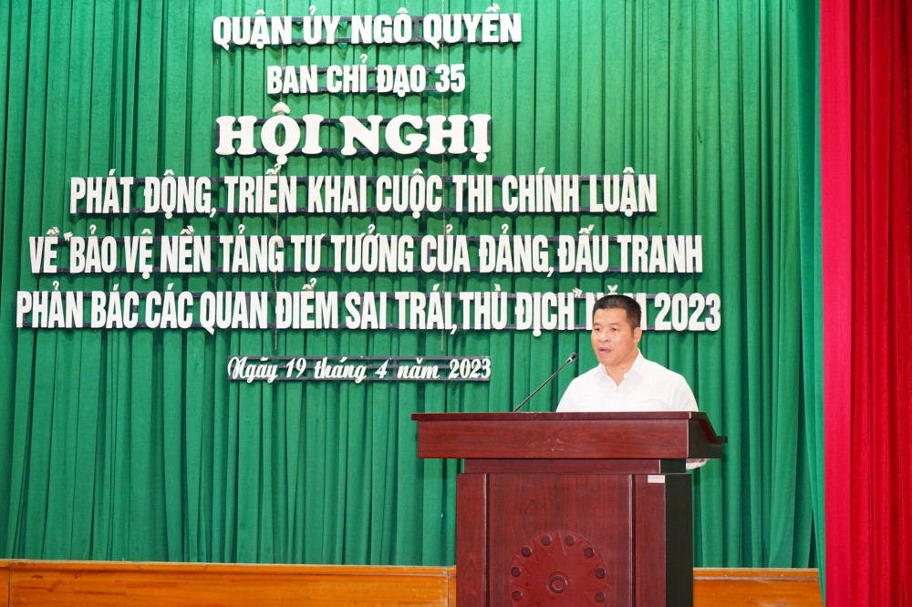 Nhằm tiếp tục tuyên truyền, lan tỏa, nâng cao nhận thức, trách nhiệm của cán bộ, đảng viên và Nhân dân về nhiệm vụ bảo vệ nền tảng tư tưởng của Đảng, đấu tranh phản bác các quan điểm sai trái, thù địch trong tình hình mới. Chiều 19/4, Ban Chỉ đạo 35 Quận Ngô Quyền tổ chức Hội nghị phát động, triển khai Cuộc thi chính luận về “Bảo vệ nền tảng, tư tưởng của Đảng, đấu tranh, phản bác các quan điểm sai trái, thù địch” năm 2023.