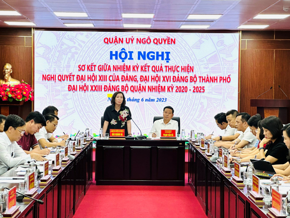 Phát biểu tại Hội nghị, đồng chí Đào Khánh Hà, Trưởng Ban Tuyên giáo Thành ủy đánh giá cao kết quả Đảng bộ quận Ngô Quyền đạt được trong nửa đầu nhiệm kỳ. Đề cập về nhiệm vụ trọng tâm trong thời gian tới, đồng chí đề nghị Quận ủy Ngô Quyền tiếp tục rà soát, tập trung cao chỉ đạo thực hiện những chỉ tiêu chưa đạt tiến độ đề ra, trong đó cần chú trọng công tác giáo dục chính trị tư tưởng; chuẩn bị tốt công tác cán bộ cho nhiệm kỳ mới bảo đảm đúng cơ cấu thành phần, ngang tầm nhiệm vụ; kịp thời tháo gỡ vướng mắc, đẩy nhanh tiến độ giải phóng mặt bằng các dự án trọng điểm trên địa bàn; tập trung thu ngân sách, cải thiện môi trường đầu tư kinh doanh, thu hút doanh nghiệp; khai thác hiệu quả quỹ đất cho phát triển đô thị, hiện thực hóa mục tiêu xây dựng quận trở thành Trung tâm thương mại-dịch vụ của thành phố.