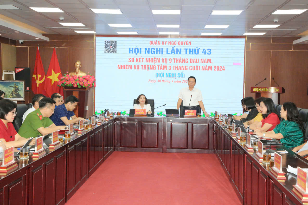Chiều 30/9, Quận ủy Ngô Quyền tổ chức Hội nghị sơ kết nhiệm vụ 9 tháng, triển khai nhiệm vụ trọng tâm 3 tháng cuối năm 2024. Dự hội nghị có đồng chí Đào Khánh Hà, Ủy viên Ban Thường vụ Thành ủy, Trưởng Ban Tuyên giáo Thành ủy.