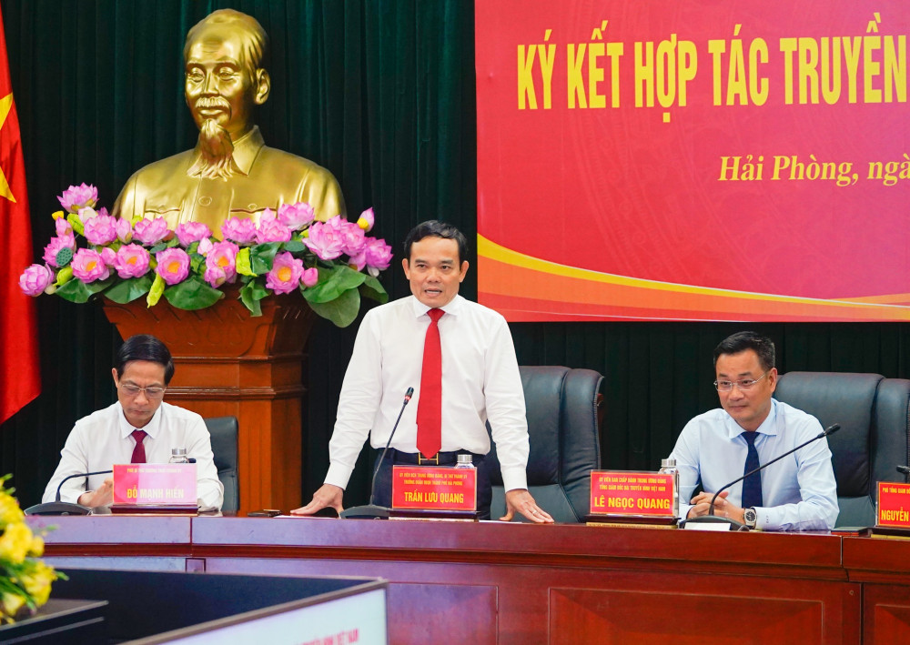Phát biểu tại Lễ ký kết, đồng chí Trần Lưu Quang, Bí thư Thành ủy bày tỏ cảm ơn sự quan tâm, đồng hành của Đài Truyền hình Việt Nam trong công tác tuyên truyền góp phần thúc đầy phát triển KTXH của thành phố Hải Phòng trong thời gian qua. Đồng thời mong muốn thông qua các kênh truyền hình và nền tảng số của Đài Truyền hình Việt Nam thời gian tới sẽ góp phần quảng bá về hình ảnh con người và mảnh đất Hải Phòng, phát huy mạnh mẽ được những tiềm năng thế mạnh của thành phố…