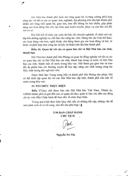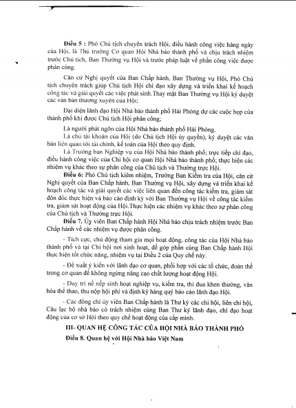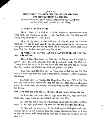 Ngày 6/9/2019, Ban Chấp hành Hội Nhà báo Hải Phòng đã ra Quyết định số 104/QĐ-HNB về việc ban hành Quy chế hoạt động của Ban Chấp hành Hội Nhà báo Hải Phòng khóa VII (nhiệm kỳ 2019-2024).