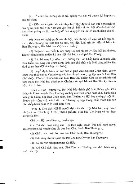 Quy chế xác định và cụ thể hóa nhiệm vụ, quyền hạn của Ban Chấp hành, Ban Thường vụ và các Uỷ viên Ban Chấp hành Hội Nhà báo Hải Phòng trong nhiệm kỳ VII (2019-2024). Quy chế này cũng xác định mối quan hệ công tác giữa Hội Nhà báo Hải Phòng với các cơ quan quản lý báo chí; các cơ quan báo chí; các cơ quan hữu quan của thành phố Hải Phòng, nhằm tiếp tục nâng cao vai trò, chất lượng hoạt động Hội Nhà báo thành phố trong thời kỳ mới.
