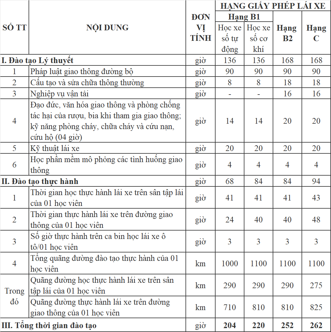 Cơ sở đào tạo lái xe căn cứ các nội dung gồm: khối lượng chương trình và phân bổ thời gian đào tạo quy định nêu trên, thời gian ôn tập, kiểm tra hết môn và nghỉ lễ; để xây dựng tổng thời gian khóa đào tạo trong chương trình đào tạo lái xe đảm bảo đạt được mục tiêu: hạng B1 chương trình đào tạo thường xuyên và đối với hạng B2, hạng C là trình độ sơ cấp.