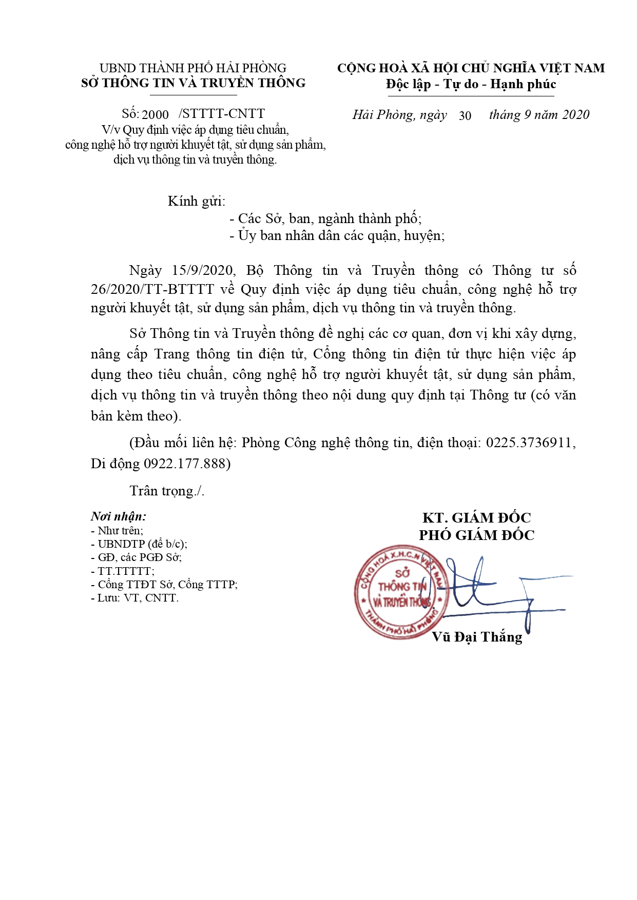 Thực hiện Thông tư số 26/2020/TT-BTTTT ngày 15/9/2020 của Bộ Thông tin và Truyền thông về Quy định việc áp dụng tiêu chuẩn, công nghệ hỗ trợ người khuyết tật, sử dụng sản phẩm, dịch vụ thông tin và truyền thông, Sở Thông tin và Truyền thông thành phố Hải Phòng vừa có văn bản đề nghị các cơ quan, đơn vị khi xây dựng, nâng cấp Trang thông tin điện tử, Cổng thông tin điện tử thực hiện việc áp dụng theo tiêu chuẩn, công nghệ hỗ trợ người khuyết tật, sử dụng sản phẩm, dịch vụ thông tin và truyền thông theo nội dung quy định tại Thông tư (có văn bản kèm theo).