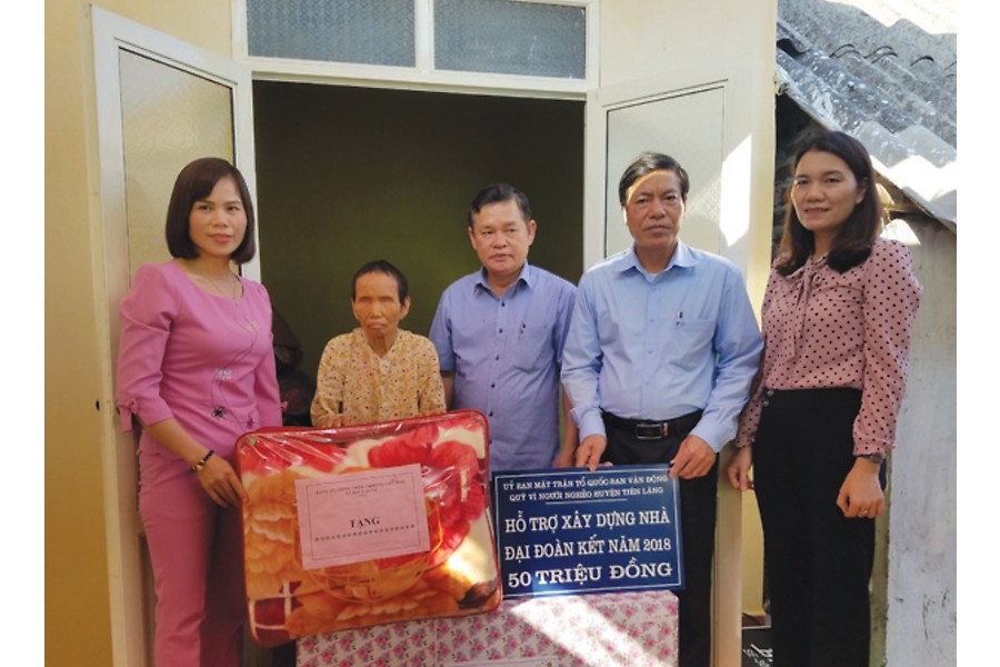 Buổi chiều ngày đầu tháng 11 vừa qua, nắng hanh vàng nhuộm rực khoảnh sân nhà bà Phạm Thị Quy, sinh năm 1944, ở thôn Xuân Hòa, xã Bạch Đằng (huyện Tiên Lãng). Anh em họ hàng, làng xóm đến chung vui với người phụ nữ đơn thân, bị khuyết tật có ngôi nhà mới. Ngôi nhà lợp mái ngói đỏ tươi, công trình phụ khép kín với tổng kinh phí xây dựng 91 triệu đồng thay thế ngôi nhà cũ, dột nát. Nguồn kinh phí này được Quỹ “Vì người nghèo” thành phố hỗ trợ 50 triệu đồng, còn lại là tiền quyên góp từ anh em họ hàng. Ngồi cạnh người em họ đáng thương, ông Phạm Văn Xảo, người nhận trách nhiệm chăm sóc bà Quy sau khi bố mẹ bà qua đời, cho biết: “Khoản trợ cấp 675 nghìn đồng hằng tháng chỉ đủ để bà ấy mua thuốc uống. Được lãnh đạo chính quyền địa phương quan tâm, đề xuất cấp trên hỗ trợ kinh phí, anh em họ hàng chung tay mỗi người một ít, ước mơ có ngôi nhà chắc chắn của em tôi sinh sống những năm cuối đời mới thành hiện thực”. Ngay trong lễ khánh thành, bàn giao nhà mới, Ủy ban MTTQ huyện Tiên Lãng, lãnh đạo chính quyền địa phương, dòng họ tiếp tục trao các vật dụng thiết yếu giúp bà Quy ổn định cuộc sống. Ủy ban MTTQ huyện Tiên Lãng cũng trao kinh phí hỗ trợ sản xuất tặng 5 hộ nghèo trên địa bàn huyện, mỗi suất trị giá 5 triệu đồng. Là một trong 5 hộ được nhận hỗ trợ, chị Lương Thị Huyền, thôn Xuân Làng, xã Bắc Hưng xúc động: “Gia đình tôi có 6 người, chỉ trông chờ vào đồng lương công nhân của tôi và thu nhập từ 8 sào ruộng. Số tiền 5 triệu đồng này tôi sẽ sử dụng để mua phân bón cho lứa tỏi giống”.