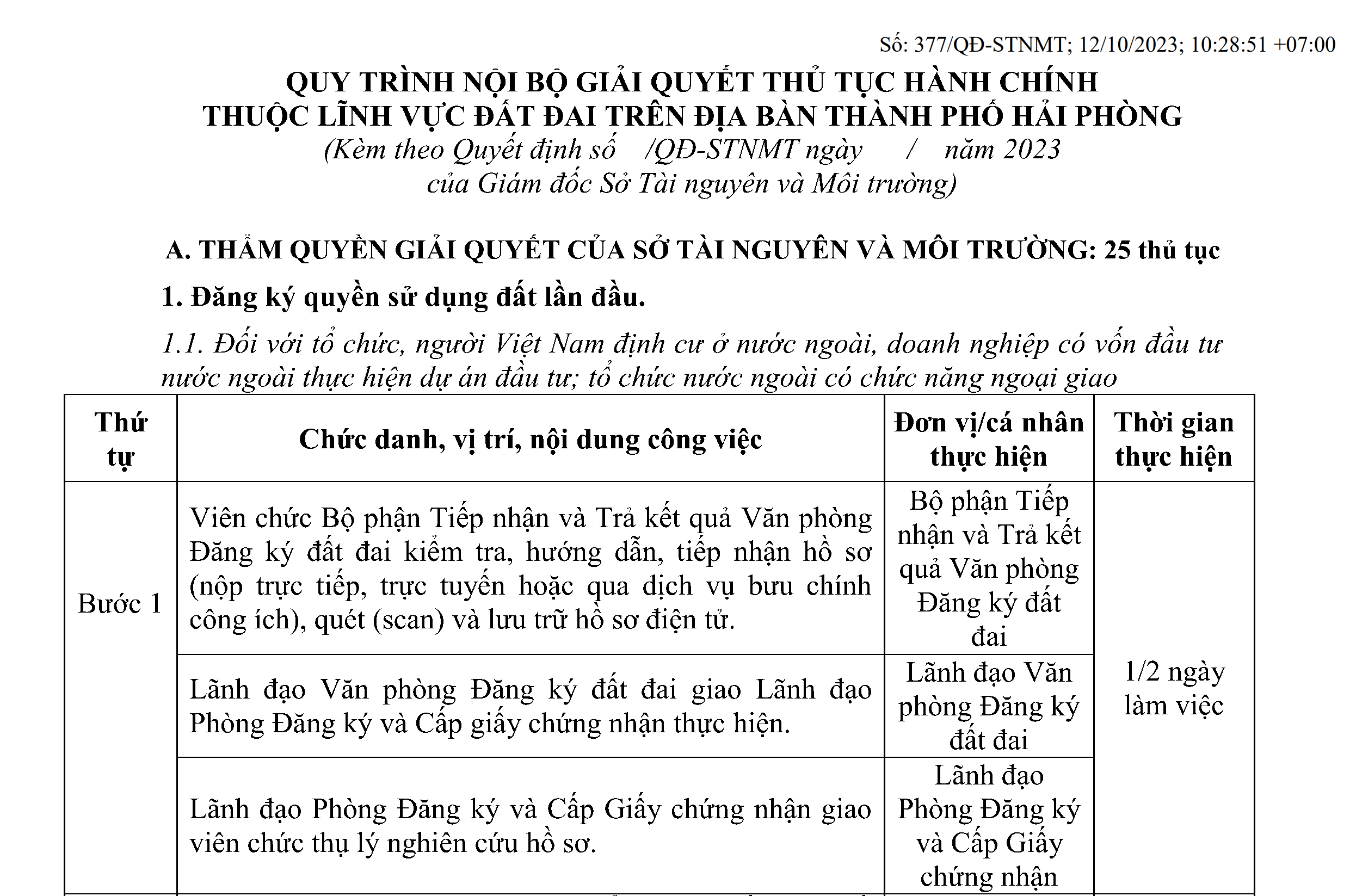 Sở Tài nguyên và Môi trường vừa có Quyết định số 377/QĐ-STNMT ngày 12/10/2023 ban hành Quy trình nội bộ trong giải quyết thủ tục hành chính lĩnh vực đất đai trên địa bàn thành phố.