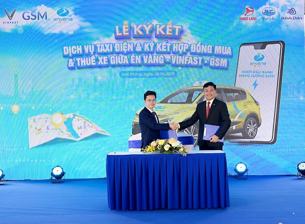 Công ty Én Vàng Quốc tế vừa ký kết hợp Hợp đồng mua và thuê xe điện số lượng lớn với Công ty Cổ phần Di chuyển Xanh và Thông minh (GSM) và VinFast, đồng thời, chính thức ra mắt dịch vụ taxi điện đầu tiên tại Hải Phòng. Dự buổi ra mắt có Đại tá Bùi Trung Thành, Phó Giám đốc Công an thành phố.