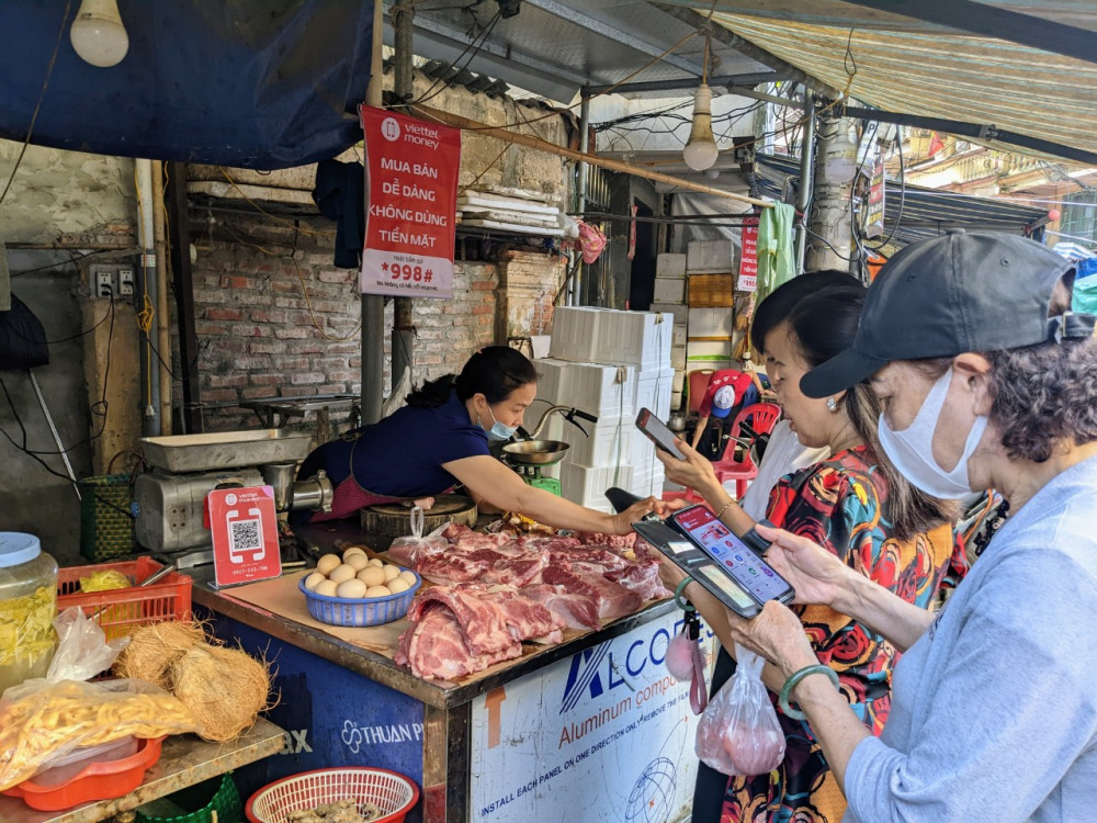 * Cách sử dụng: (1) Người dân đi chợ sử dụng App Viettel Money hoặc các App Ngân hàng thực hiện quét mã QR code có sẵn tại gian hàng (là điểm chấp nhận thanh toán); (2) App hiển thị ra đúng thông tin của người bán và nhập số tiền cần thanh toán; (3) Xác nhận và hoàn thành. Ngay lập tức, người bán và người mua đều nhận được tin nhắn thông báo biến động số dư.