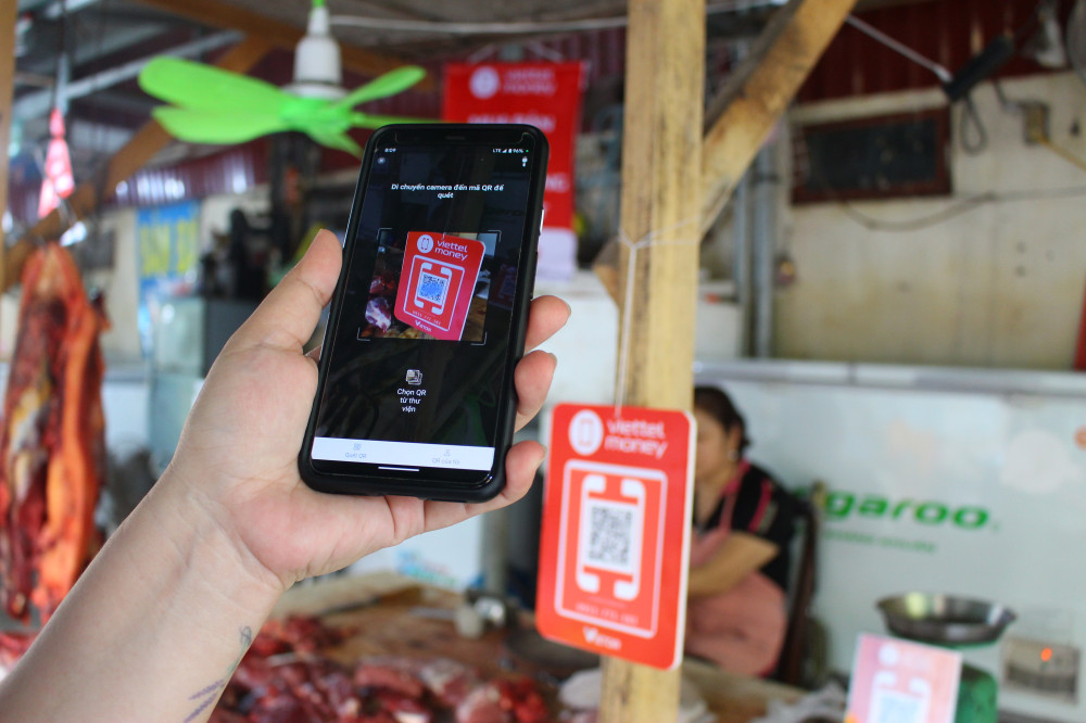 * Cách sử dụng: (1) Người dân đi chợ sử dụng App Viettel Money hoặc các App Ngân hàng thực hiện quét mã QR code có sẵn tại gian hàng (là điểm chấp nhận thanh toán); (2) App hiển thị ra đúng thông tin của người bán và nhập số tiền cần thanh toán; (3) Xác nhận và hoàn thành. Ngay lập tức, người bán và người mua đều nhận được tin nhắn thông báo biến động số dư.