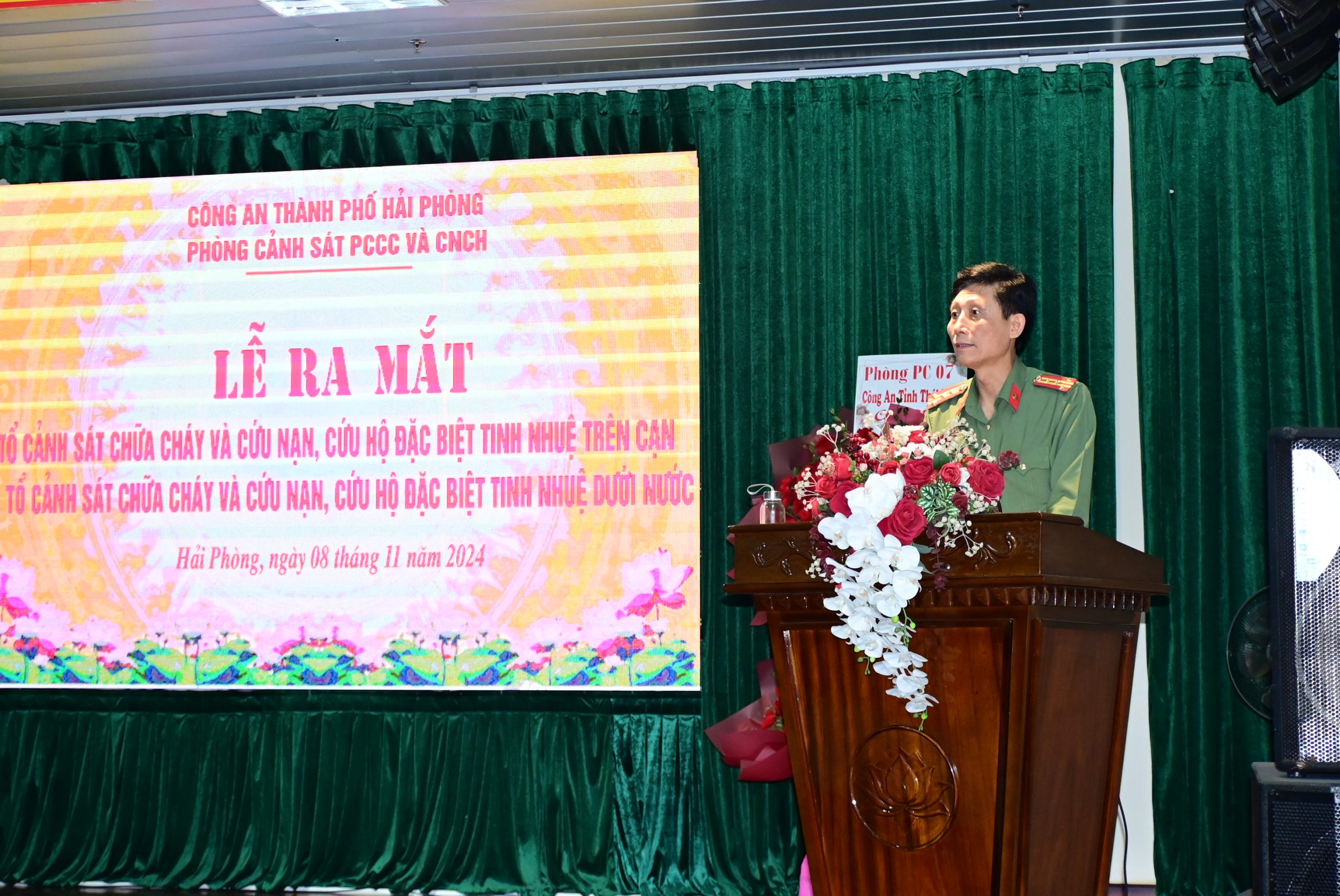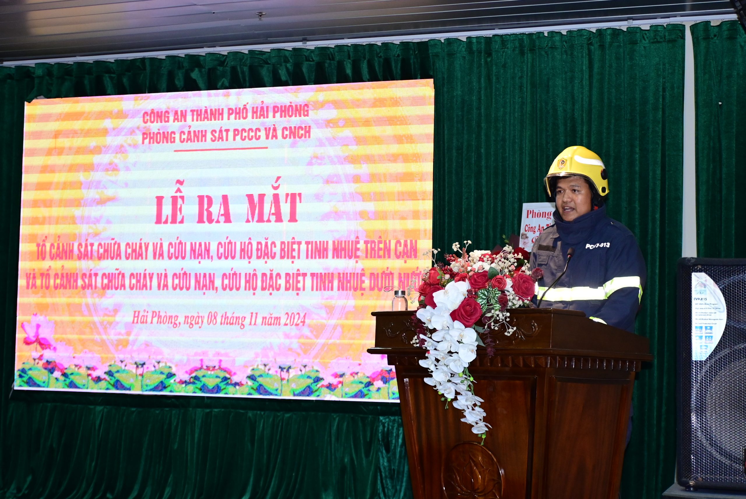 Phát biểu tại lễ ra mắt, đồng chí Phó giám đốc Công an thành phố khẳng định, việc thành lập thí điểm 2 Tổ Cảnh sát chữa cháy và CNCH đặc biệt tinh nhuệ trên cạn và dưới nước là dấu mốc quan trọng trong quá trình xây dựng, phát triển lực lượng Cảnh sát PCCC và CNCH nói chung và lực lượng Cảnh sát PCCC và CNCH Công an thành phố Hải Phòng nói riêng. Cán bộ, chiến sĩ thuộc 2 Tổ Cảnh sát chữa cháy và CNCH đặc biệt tinh nhuệ có bản lĩnh chính trị vững vàng, được đào tạo bài bản, giỏi về nghiệp vụ, từng xông pha chữa cháy, CNCH tại các vụ cháy, sự cố, tai nạn phức tạp, cứu được hàng trăm người, có nhiều thành tích cao… được lựa chọn từ các đơn vị Cảnh sát PCCC và CNCH thuộc Công an thành phố, được trang bị phương tiện, thiết bị chữa cháy và CNCH hiện đại, có chức năng, nhiệm vụ giải quyết các vụ cháy nổ, sự cố, tai nạn có tính chất phức tạp, nghiêm trọng, đặc thù trên cạn và dưới nước, là đơn vị chủ công, nòng cốt của lực lượng Cảnh sát PCCC và CNCH, Công an thành phố trong thời gian tới. Để đảm nhận được trọng trách trên, đồng chí cũng yêu cầu mỗi cán bộ, chiến sĩ trong 2 Tổ công tác phải nêu cao tinh thần, trách nhiệm trong thực hiện nhiệm vụ.