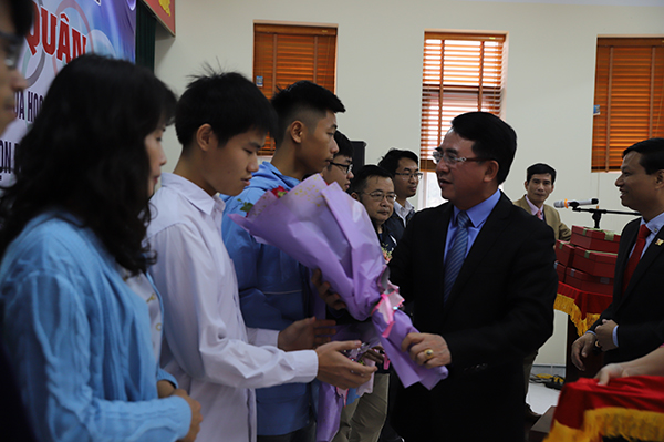 Giám đốc Sở GD-ĐT Nguyễn Xuân Trường tặng hoa chúc mừng các tuyển thủ