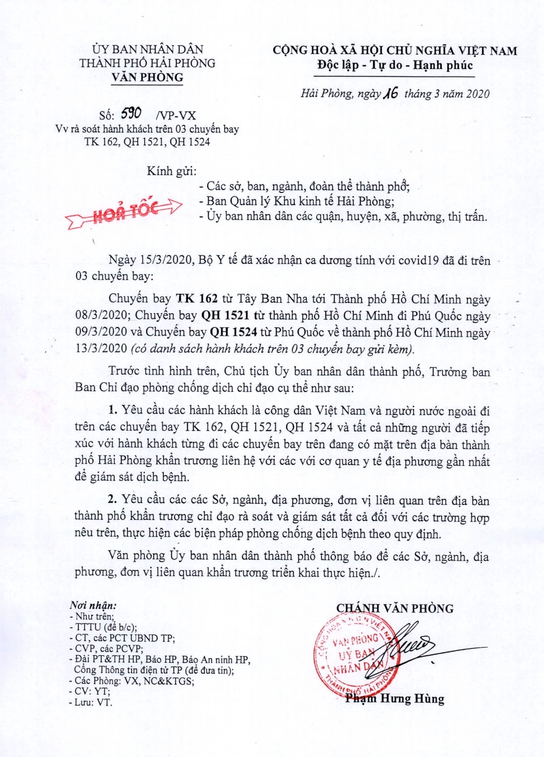 Chủ tịch UBND thành phố, Trưởng ban Ban Chỉ đạo phòng chống dịch vừa có chỉ đạo yêu cầu hành khách là công dân Việt Nam và người nước ngoài đi trên các chuyến bay TK162, QH1521, QH1524 và tất cả những người đã tiếp xúc với hành khách từng đi các chuyến bay trên đang có mặt trên địa bàn thành phố Hải Phòng khẩn trương liên hệ với các cơ quan y tế địa phương gần nhất để giám sát dịch bệnh.
