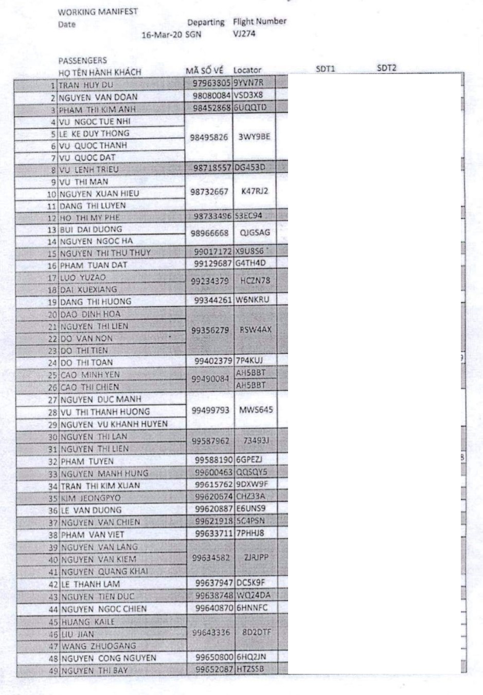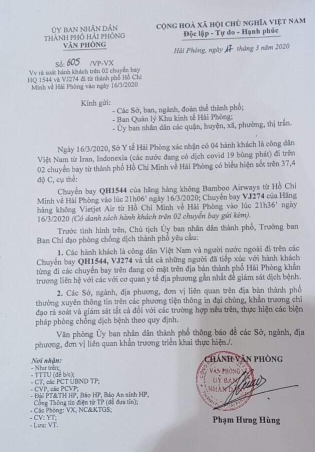 Cụ thể: Chuyến bay QH1544 của hãng hàng không Bamboo Airway từ TP. Hồ Chí Minh về Hải Phòng lúc 21h06′ ngày 16/3/2020; Chuyến bay VJ274 của hãng hàng không VietJet Air từ TP. Hồ Chí Minh về Hải Phòng vào lúc 21h36′ ngày 16/3/2020.