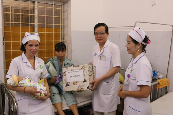 TS.BS Vũ Quang Vinh – Phó Giám đốc bệnh viện cùng lãnh đạo một số khoa, phòng và cán bộ viên chức khoa Sản 1 ngày 22/7/2019 đã đến tặng hoa, quà chúc mừng mẹ con sản phụ Nga. Đội ngũ y bác sĩ bệnh viện ân cần thăm hỏi chăm sóc, động viên tinh thần sản phụ cùng gia đình.