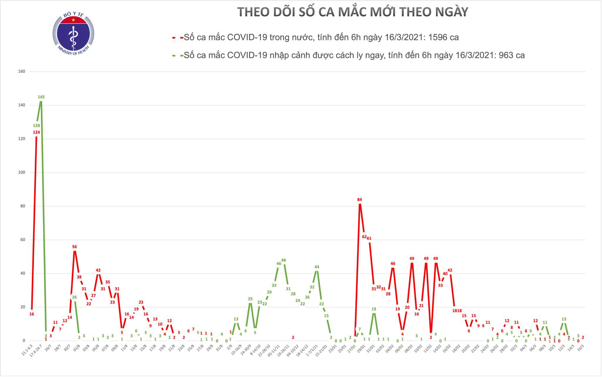 Tính đến 6h ngày 16/3: Việt Nam có tổng cộng 1596 ca mắc COVID-19 do lây nhiễm trong nước.
