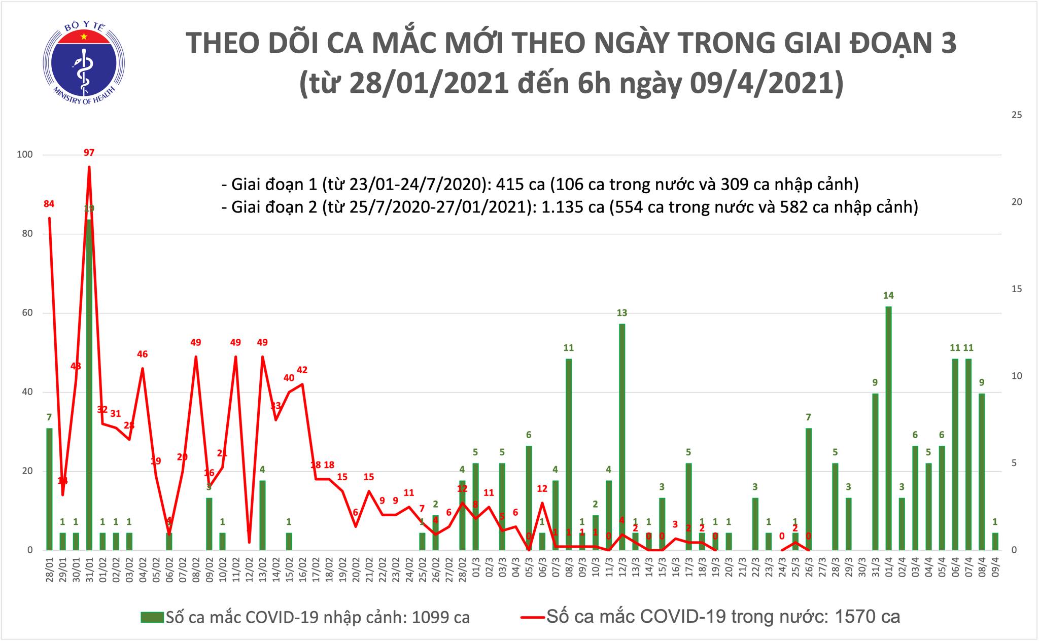 – Tính đến 6h ngày 09/4: Việt Nam có tổng cộng 1570 ca mắc COVID-19 do lây nhiễm trong nước, trong đó số lượng ca mắc mới tính từ ngày 27/1 đến nay: 910 ca, riêng Hải Dương có 726 ca, Quảng Ninh (61 ca), Gia Lai (27 ca), Hà Nội (34 ca), Bắc Ninh (5 ca), Bắc Giang (2 ca), TP. Hồ Chí Minh (36 ca ), Hoà Bình (2 ca), Hà Giang (1 ca), Điện Biên (3 ca), Bình Dương (6 ca), Hải Phòng (4 ca ), Hưng Yên (3 ca).