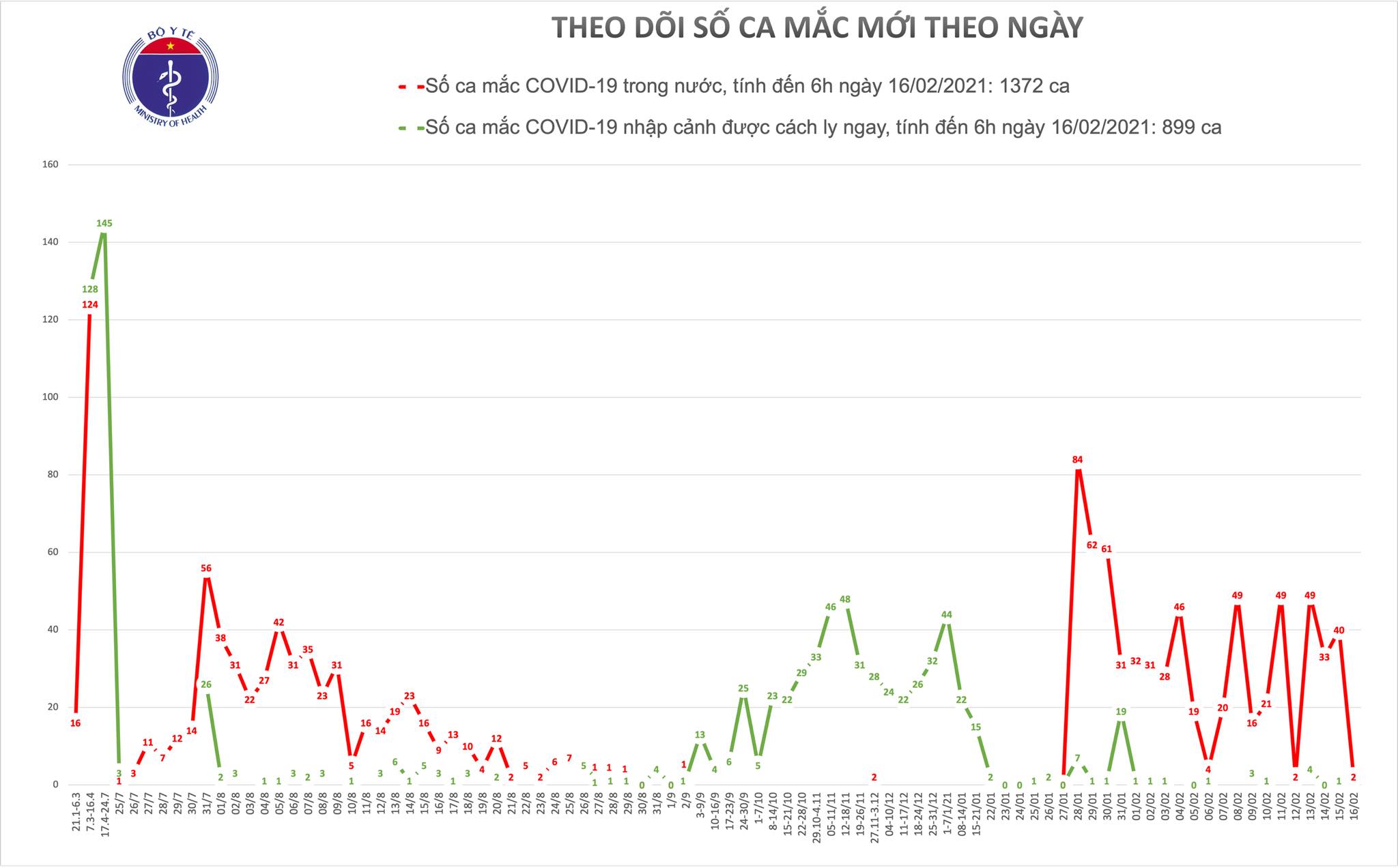 – Tính từ 18h ngày 15/02 đến 6h ngày 16/02: 2 ca mắc mới, trong đó có 0 ca nhập cảnh được cách ly ngay.