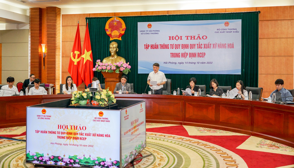 Với mục đích phổ biến về Hiệp định RCEP, đặc biệt về quy tắc xuất xứ hàng hóa trong RCEP, tại Hội thảo các đại biểu tham dự đã nghe đại diện Cục Xuất nhập khẩu, Bộ Công Thương giới thiệu về Quy tắc xuất xứ trong RCEP; hướng dẫn việc xác định nước xuất xứ trong trường hợp một nước đối xử khác biệt thuế; hướng dẫn khai báo xuất xứ trên C/O RCEP; đồng thời giới thiệu một số mặt hàng của Việt Nam có lợi thế xuất khẩu trong RCEP.