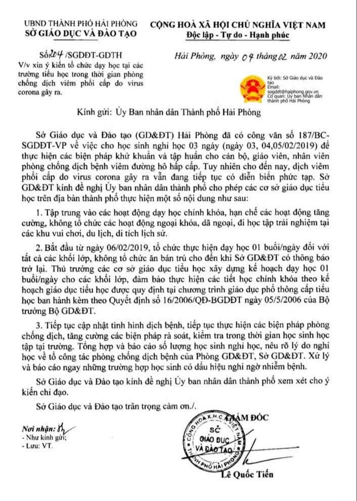 Ngày 04/02/2020, Sở Giáo dục và Đào tạo (Sở GD&ĐT) có văn bản số 204/SGDĐT-GDTH gửi UBND thành phố v/v xin ý kiến tổ chức dạy học tại các trường tiểu học trong thời gian phòng chống dịch viêm phổi cấp do virus Corona gây ra.