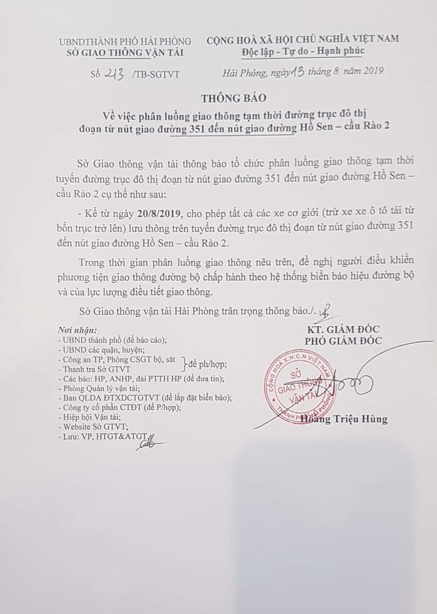 Sở Giao thông Vận tải thông báo, kể từ ngày 20/8/2019, tổ chức phân luồng giao thông tạm thời tuyến đường trục đô thị đoạn từ nút giao đường 351 đến nút giao đường Hồ Sen – Cầu Rào 2, cụ thể như sau:
