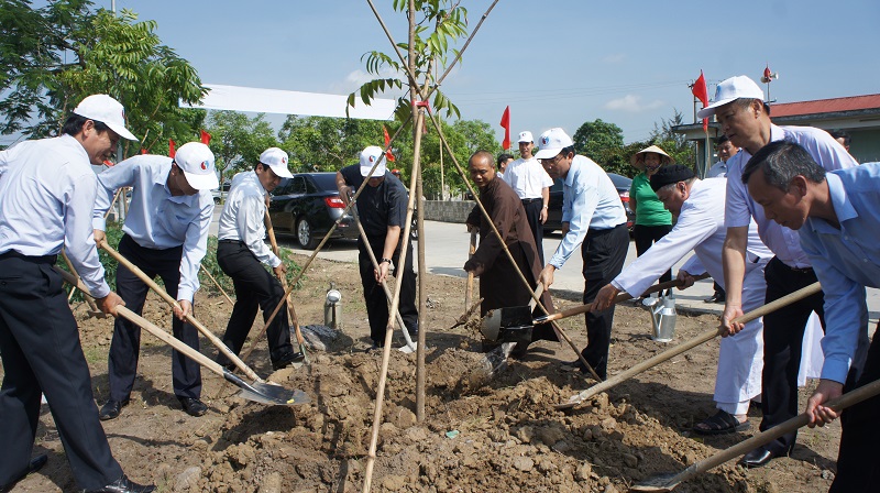 Các đồng chí Nguyễn Văn Thành – Phó Chủ tịch UBND thành phố; Cao Xuân Liên – Chủ tịch UBMTTQ Việt Nam thành phố; Đỗ Tràng Thành – Phó Chủ tịch UBMTTQ Việt Nam thành phố cùng đại diện các sở, ban, ngành, tổ chức tôn giáo trồng cây hưởng ứng ngày môi trường thế giới tại xã Đặng Cương