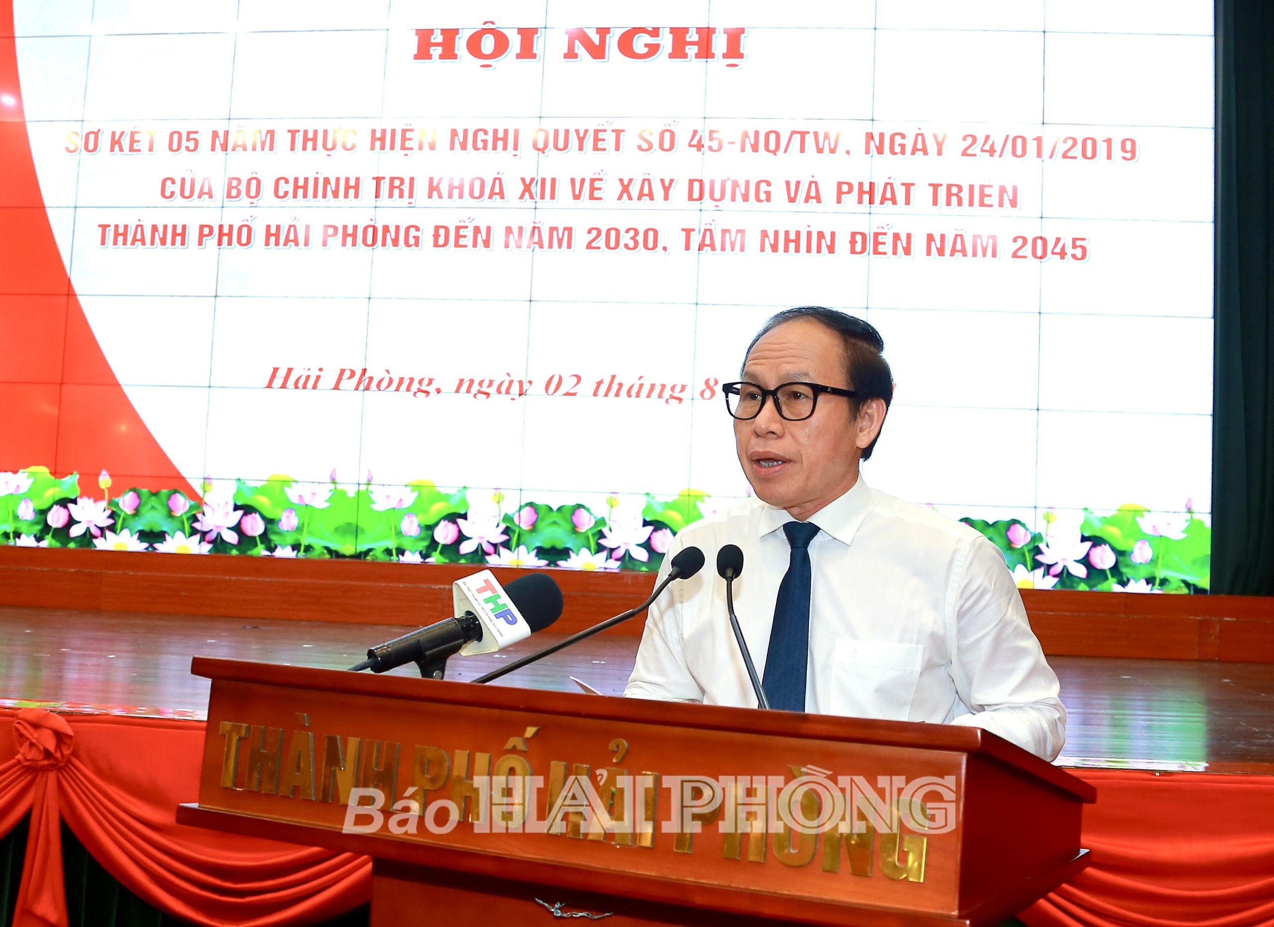Kết quả, sau 5 năm tổ chức thực hiện, nhiều kế hoạch, chương trình, đề án được ban hành; nhiều nguồn lực được bố trí để triển khai, nhất là các lĩnh vực mũi nhọn. Hải Phòng tiếp tục khẳng định vai trò là trung tâm kinh tế – xã hội lớn của vùng Đồng bằng sông Hồng và cả nước. Phát triển kinh tế – xã hội đạt nhiều kết quả ấn tượng, là điểm sáng của cả nước; đời sống vật chất, văn hóa và tinh thần của nhân dân thành phố tiếp tục được nâng lên. Những thành tựu mà thành phố Hải Phòng đạt được trong 5 năm qua khẳng định tính đúng đắn của các chủ trương, định hướng của Nghị quyết số 45 và nghị quyết đang thực sự đi vào cuộc sống.