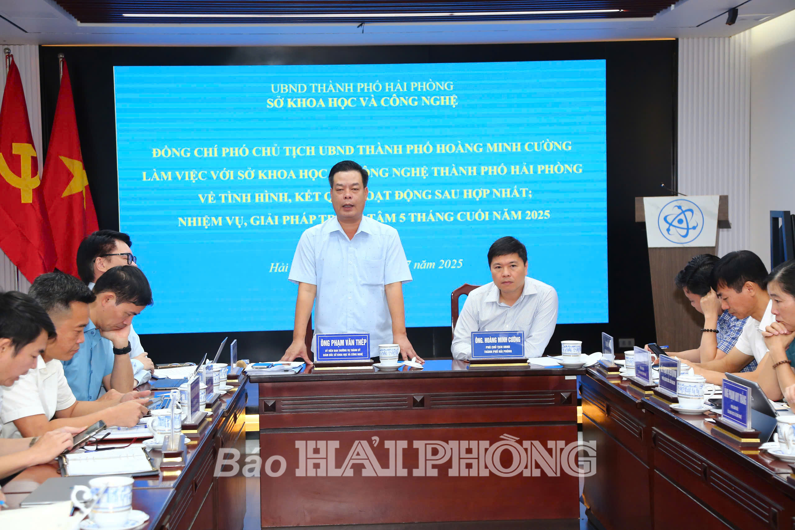 Sáng 29-7, các đồng chí: Phạm Văn Thép, Ủy viên Ban Thường vụ Thành ủy, Giám đốc Sở Khoa học và Công nghệ (KH-CN); Hoàng Minh Cường, Phó chủ tịch UBND thành phố cùng chủ trì cuộc làm việc về tình hình, kết quả hoạt động của Sở Khoa học và Công nghệ sau hợp nhất, nhiệm vụ giải pháp trọng tâm 5 tháng cuối năm 2025.