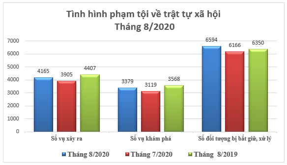 Toàn quốc xảy ra 4.165 vụ; khám phá 3.379 vụ; bắt giữ, xử lý 6.594 đối tượng; tỷ lệ khám phá đạt 81,13%; triệt phá 195 băng, nhóm. So với tháng 7/2020, tăng 260 vụ (+6,66%), tăng 260 số vụ khám phá (+8,34%), tăng 428 số đối tượng bị bắt giữ, xử lý (+6,94%). Tỷ lệ khám phá tăng; tăng 56 số băng, nhóm bị triệt phá.