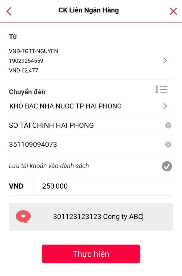 Chuyển khoản đến tài khoản của SO TAI CHINH HAI PHONG – 351109094073 tại Kho bạc nhà nước Hải Phòng.