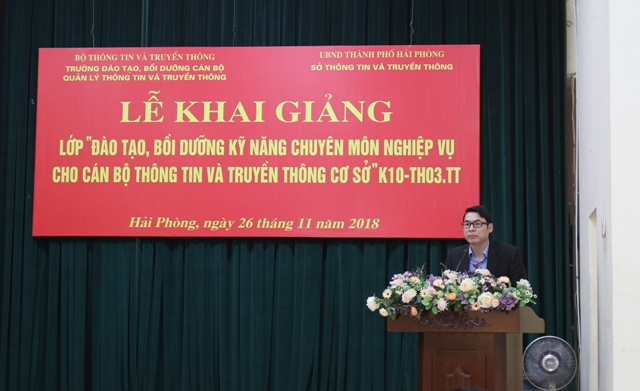 Sáng 26/11, tại hội trường các Ban xây dựng Đảng thành phố, Sở Thông tin và Truyền thông phối hợp với Trường đào tạo, bồi dưỡng cán bộ quản lý thông tin và truyền thông (Bộ Thông tin và Truyền thông) tổ chức khai giảng lớp “Đào tạo, bồi dưỡng kỹ năng chuyên môn nghiệp vụ cho cán bộ thông tin và truyền thông cơ sở”. Đồng chí Lê Văn Kiên, Phó Giám đốc Sở Thông tin và Truyền thông tới dự và phát biểu tại lễ khai giảng.