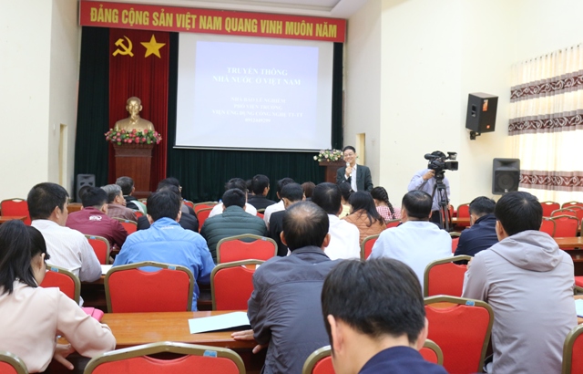 Giảng viên, nhà báo Lê Nghiêm, Phó Viện trưởng Viện Ứng dụng Công nghệ Thông tin và Truyền thông truyền đạt tới lớp học một số nội dung về kỹ năng lựa chọn đề tài, chủ đề để viết tin, bài, xây dựng chương trình phát thanh trên Cổng thông tin điện tử, Đài truyền thanh cơ sở. Trong đó, giới thiệu tổng quan về công tác truyền thông của cơ quan nhà nước và chức năng, nhiệm vụ của Cổng thông tin điện tử, Đài truyền thanh cấp huyện; Những hạn chế của công tác truyền thông cơ quan nhà nước hiện nay và vai trò của Cổng thông tin điện tử, Đài truyền thanh cấp huyện; Những biện pháp đổi mới công tác truyền thông của cơ quan nhà nước và trách nhiệm của Cổng thông tin điện tử, Đài truyền thanh cấp huyện trong tình hình hiện nay; Những trọng tâm trong công tác truyền thông của cơ quan nhà nước và nhiệm vụ của Cổng thông tin điện tử, Đài truyền thanh cấp huyện.