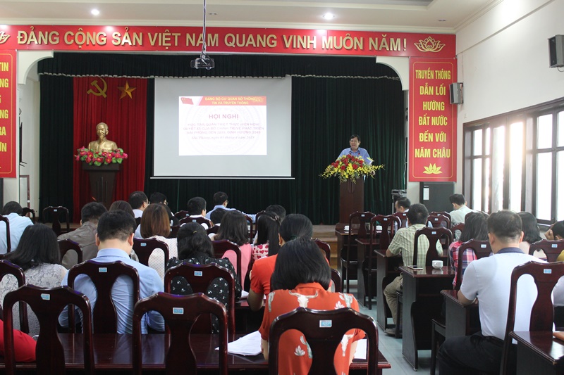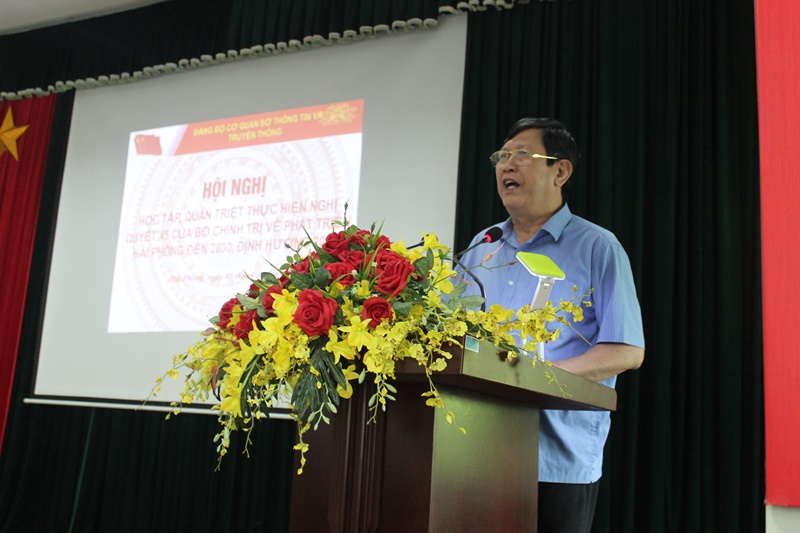 Sáng 5-4, Đảng ủy cơ quan Sở Thông tin và Truyền thông tổ chức học tập, quán triệt, tuyên truyền, triển khai thực hiện Nghị quyết 45-NQ/TW của Bộ Chính trị của Bộ Chính trị về phát triển Hải Phòng đến năm 2030, định hướng 2045. Đồng chí Nguyễn Quốc Khánh, Phó Trưởng ban Thường trực phụ trách Ban Tuyên giáo Thành ủy dự và quán triệt nội dung Nghị quyết.