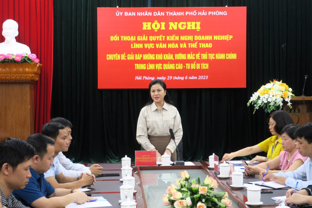 Phát biểu khai mạc Hội nghị, đồng chí Trần Thị Hoàng Mai, Giám đốc Sở Văn hóa và Thể thao mong muốn thông qua Hội nghị, Sở Văn hóa và Thể thao sẽ giải đáp, tháo gỡ những khó khăn vướng mắc của các doanh nghiệp trong việc thực hiện các chính sách pháp luật liên quan đến ngành; đồng thời tiếp nhận những ý kiến đóng góp, đề xuất của các doanh nghiệp để tổng hợp, báo cáo các cấp có thẩm quyền xem xét quyết định điều chỉnh quy trình thủ tục hành chính cho phù hợp, góp phần tạo điều kiện thuận lợi để nâng cao hiệu quả hoạt động sản xuất kinh doanh của doanh nghiệp, qua đó đồng hành cùng thành phố phát triển.