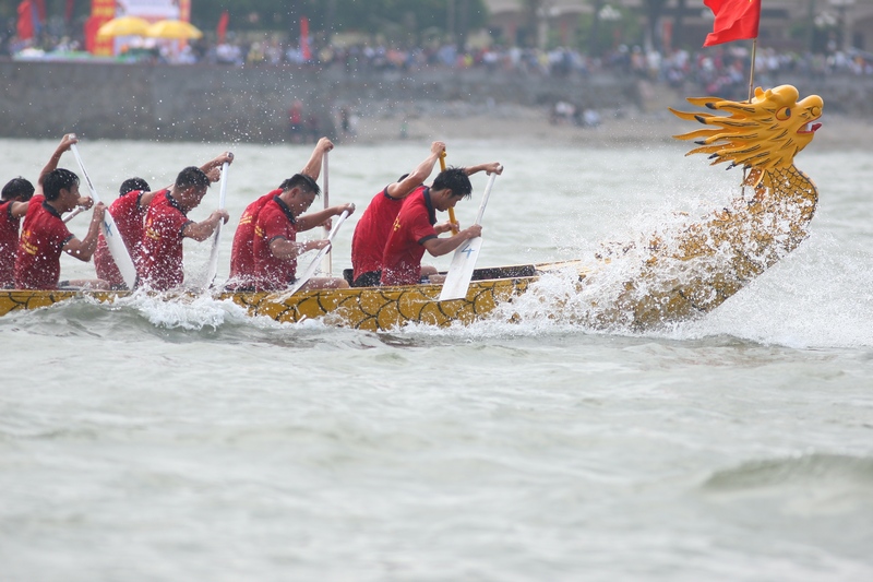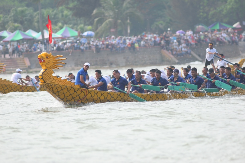 Với sức mạnh vượt trội và quen với sóng biển, những tay chèo chủ nhà Đồ Sơn (áo đỏ) đã xuất sắc vượt qua các đối thủ để giành Cúp vô địch với thành tích 28 phút 4 giây.